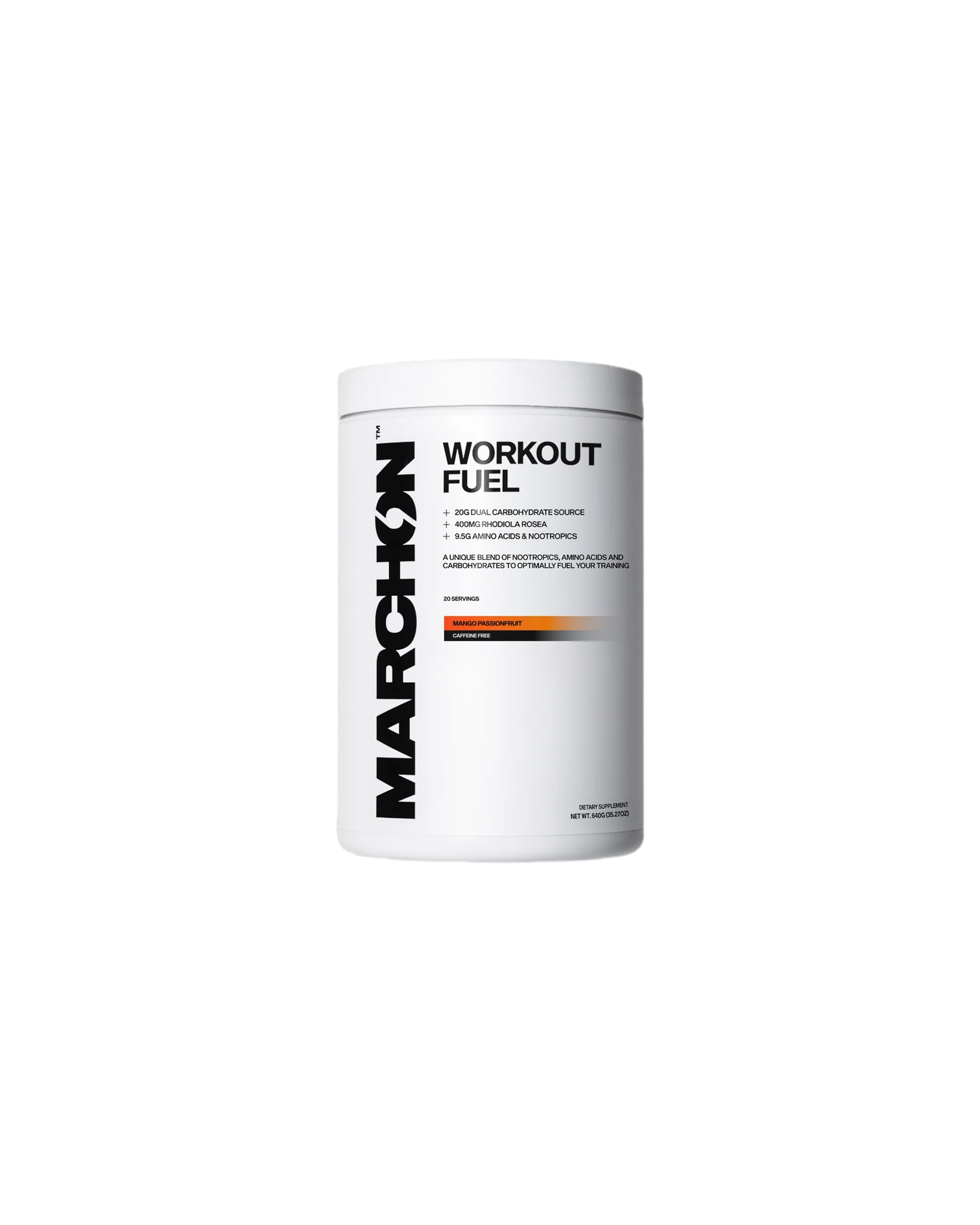 Introducing the MARCHON™ Caffeine Free Workout Fuel, the next level in optimising your workout performance. Our Caffeine Free Workout Fuel is a unique blend of nootropics, amino acids, and carbohydrates designed to fuel your workout and optimise your body and mind to train at your best. Quick & easy digesting carbs for sustained energy Increases blood flow for better exercise performance Added nootropics promote better focus and stress resilience Betapower® for increased cellular hydration and power output No stimulants so you can use this at any time of the day